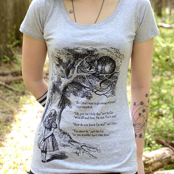 Alice Cheshire Cat ladies heather scoop neck tee and men's crewneck tee